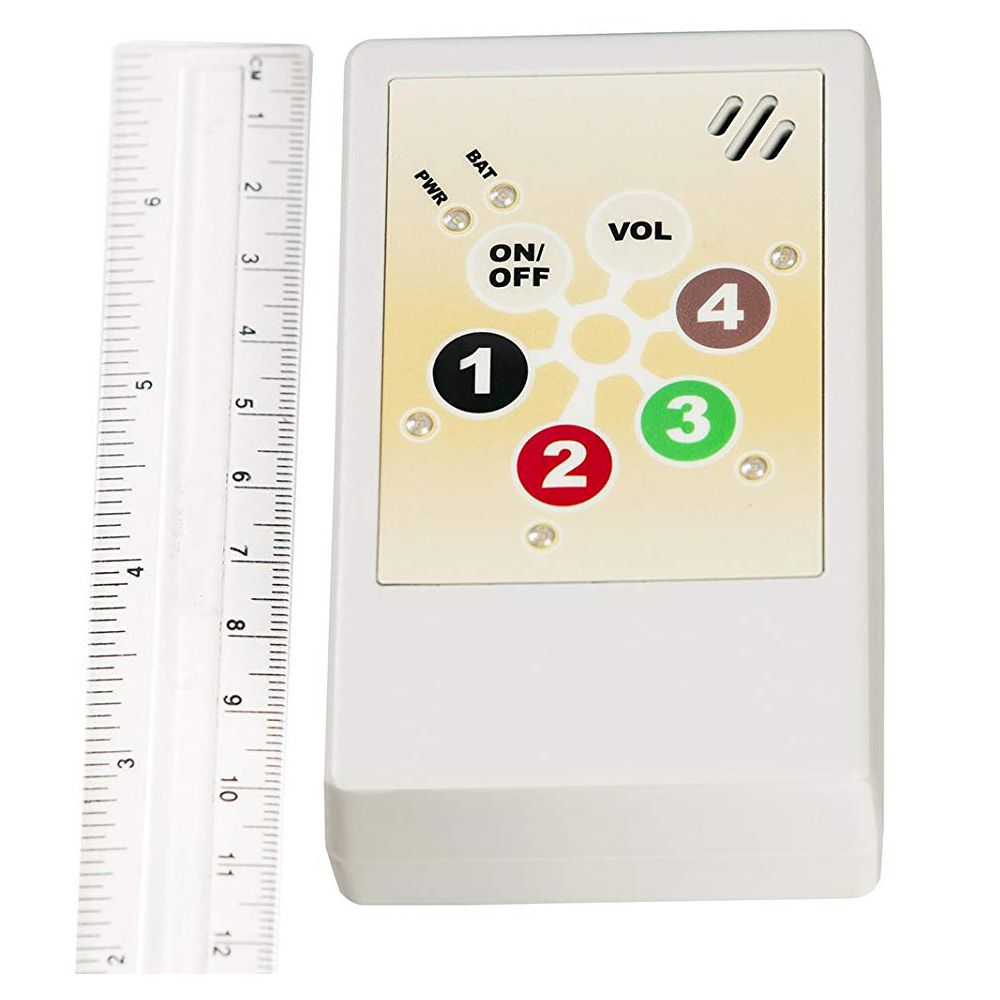 Ursprünglich wurde dieses Gerät für Praxen entwickelt und verfügt daher über vier Empfangskanäle. In diesem Set wird jedoch nur ein Kanal mit dem schwarzen Sender genutzt. Das Set kann bei Bedarf später mit weiteren Sendern und Empfängern erweitert werden. Die Reichweite beträgt im Haus 25 bis 30 Meter, je nach baulichen Gegebenheiten auch mehr.